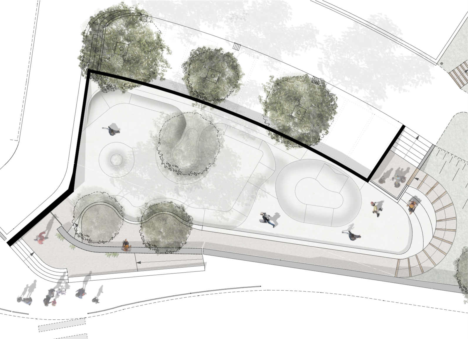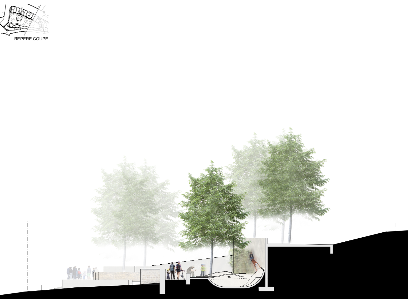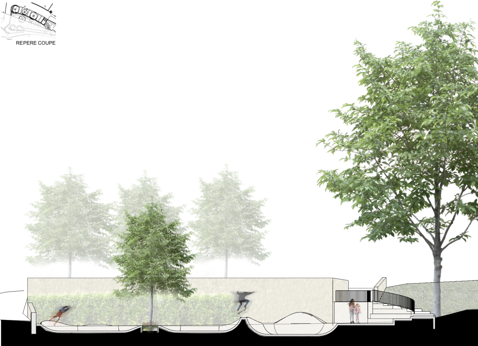 Ce projet est aussi perçu comme l’opportunité de recréer un nouvel espace public agréable. Pour ce faire nous composons aussi sur ce projet avec l’entreprise PARC&SPORT pour appor- ter un soin particulier aux espaces à proximités par la végétalisation, le traitement des sols et l’éclairage afin d’accueillir plus en amont les usagers. L’équipe sera composée de jeune pour des jeunes.