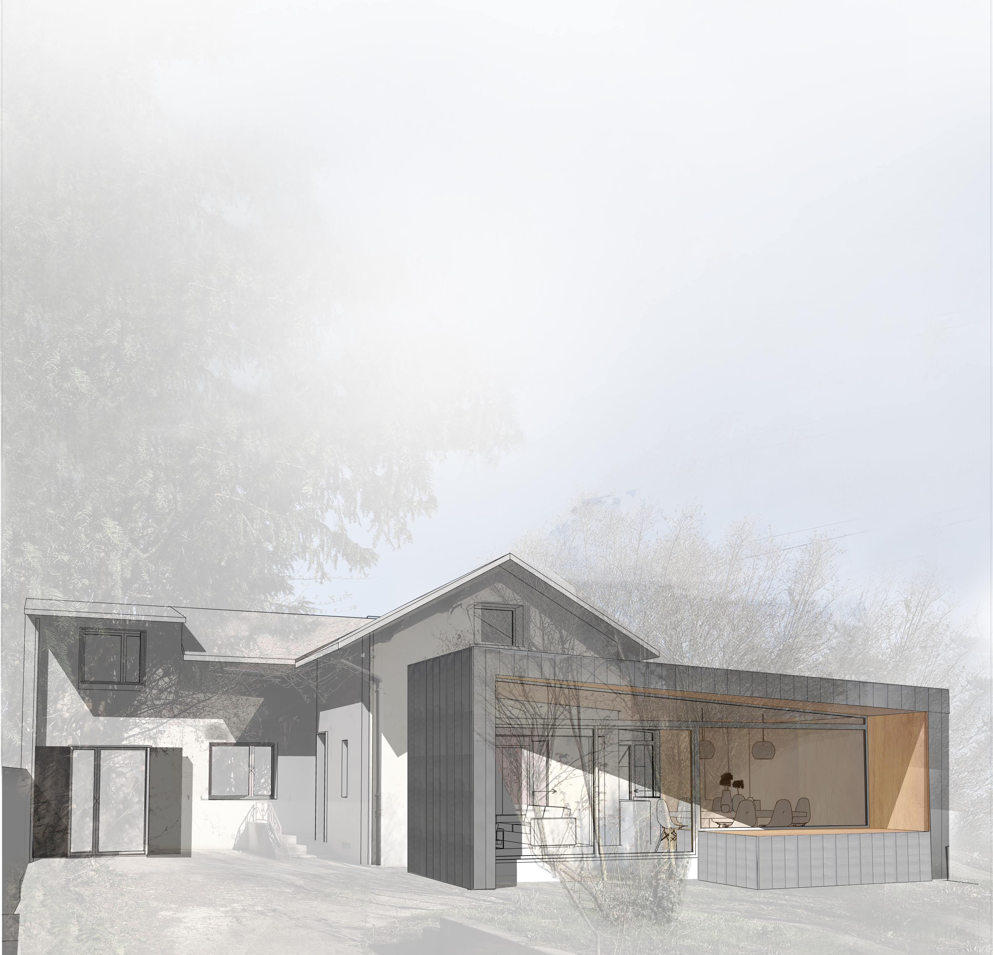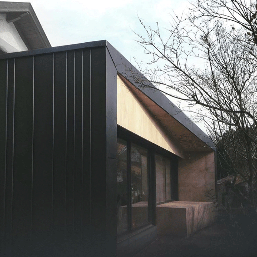 Extension en ossature bois et zinc, avec création d'un patio intérieur.