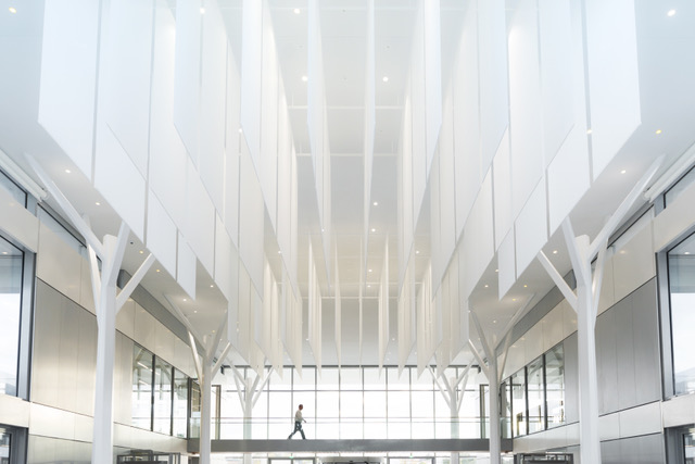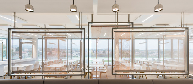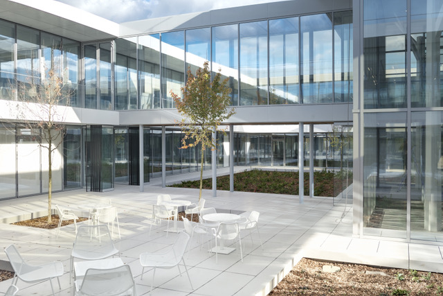 Un carré sobre et epuré en simple R+1 composé autour d’un grand atrium central, entouré par 4 patios, et relié aux ailes tertiaires par des passerelles vitrées.