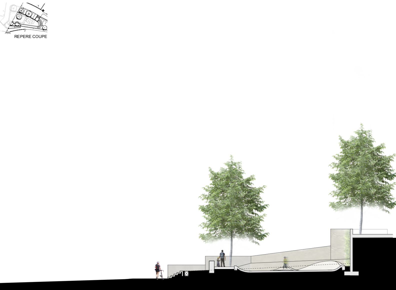 Ce projet est aussi perçu comme l’opportunité de recréer un nouvel espace public agréable. Pour ce faire nous composons aussi sur ce projet avec l’entreprise PARC&SPORT pour appor- ter un soin particulier aux espaces à proximités par la végétalisation, le traitement des sols et l’éclairage afin d’accueillir plus en amont les usagers. L’équipe sera composée de jeune pour des jeunes.